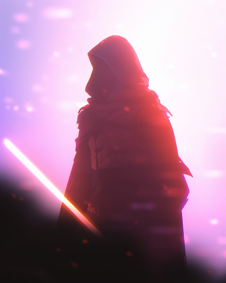 Midjourney v5.2 👆 Prompt: close-up Jedi master, in the style of backlighting, silhouette, mystery, dramatic, depth, intrigue, halo effect, rim light, sun flare, glowing edges, contrast, ethereal, separation, striking, translucency, backlight --ar 4:5 --niji 5