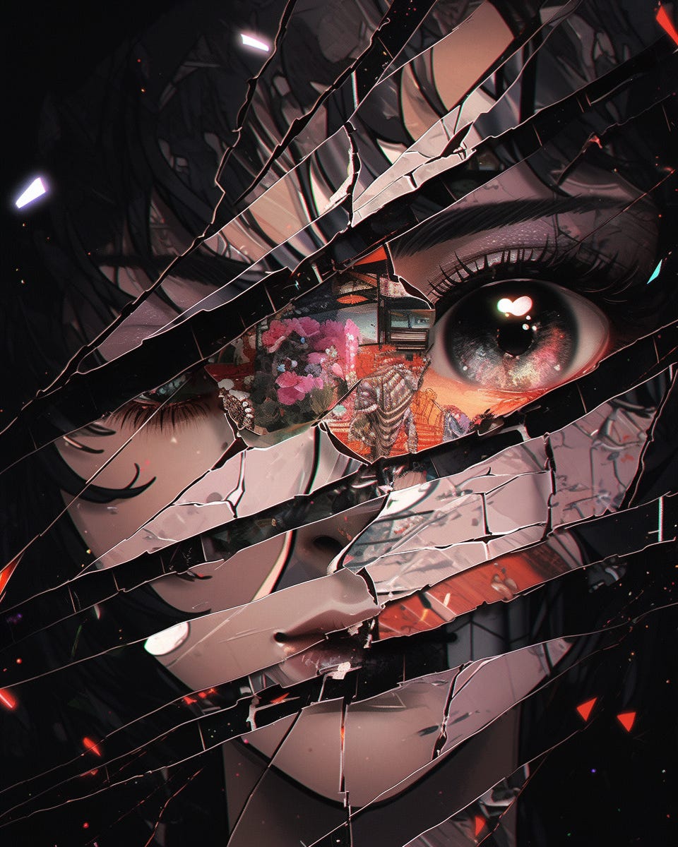 Midjourney v5.2 👆 Prompt: black mirror, in the style of digital collage, layered elements, layered visuals, realistic manga, digital patchwork, eclectic imagery, photo manipulation, overlay techniques, digital montage --ar 4:5 --niji 5