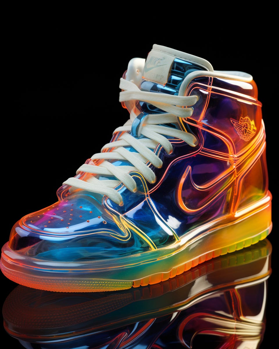 Midjourney v5.2 👆 Prompt: nike AJ1 glass-blown, glass art, colored glass replica, glass blowing, glass texture, transparent, delicate glass details --ar 80:100