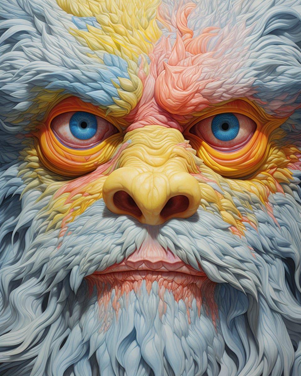 Midjourney v5.2 👆 Prompt: hyper-realistic detailed yeti, psychedelic art, hallucinatory patterns, distorted forms, kaleidoscopic, surreal, intricate --ar 80:100